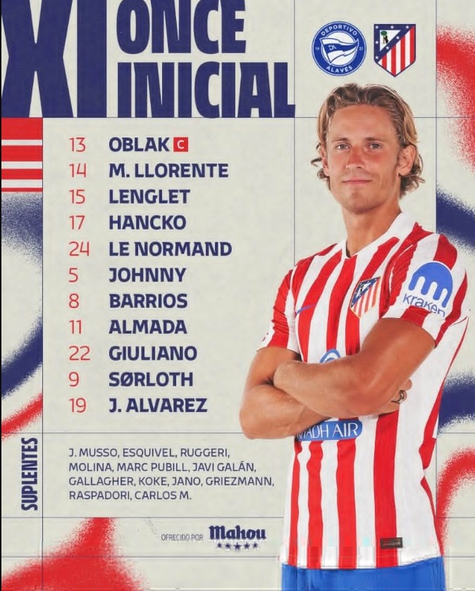 马竞客战阿拉维斯首发:小蜘蛛领衔,新援阿尔马达、汉茨科在列
