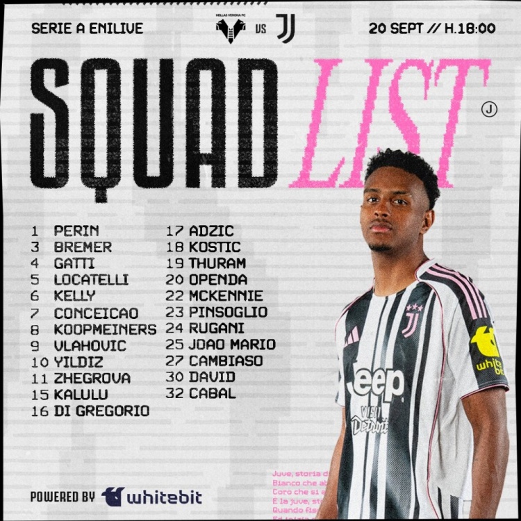 9月20日讯 北京时间9月21日凌晨0:00,2025-26赛季意甲联赛第4轮,尤文图斯将客战维罗纳。赛前,尤文官方公布了本场比赛球队大名单。