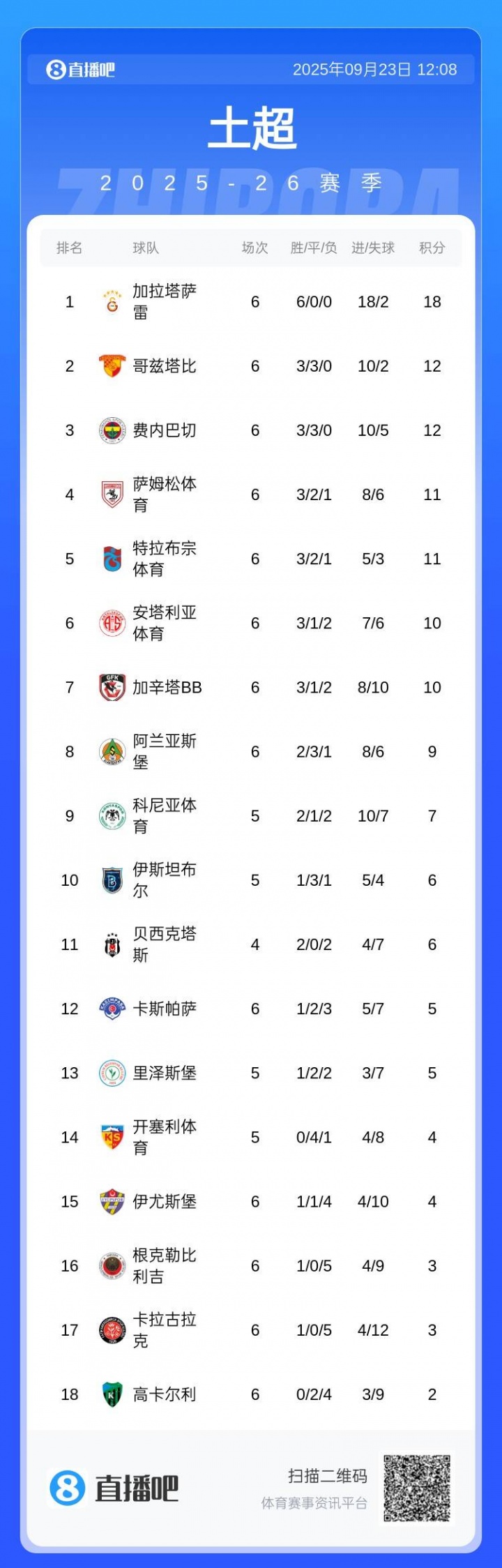 09月23日讯 土超第6轮比赛,费内巴切在半场就11打10的情况下1-1打平卡斯帕萨,加拉塔萨雷则是3-1击败科尼亚体育,继续全胜领跑土超。