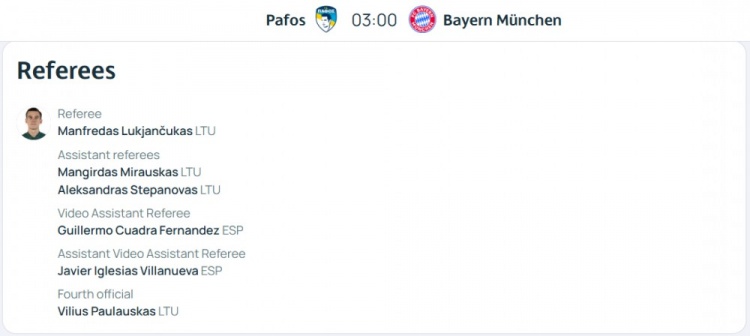 拜仁客战帕福斯裁判组名单:立陶宛主裁执法,西班牙人VAR裁判组