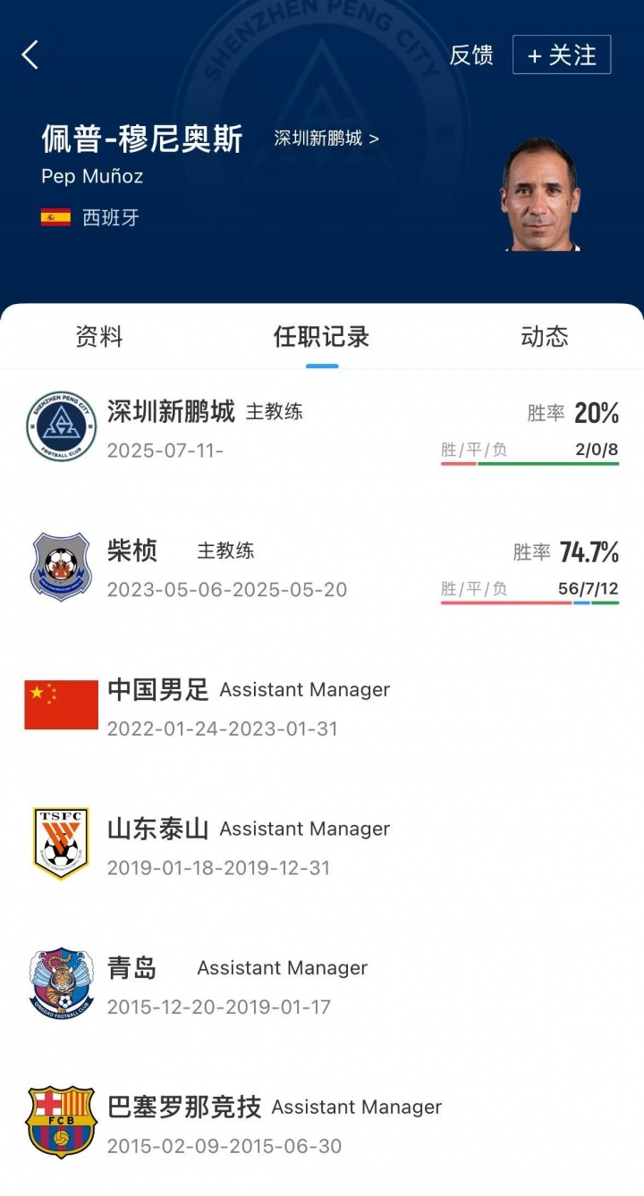 穆尼奥斯于今年7月接任深圳新鹏城主教练,接替前主帅拉坦齐奥。穆尼奥斯带队至今10场比赛2胜8负,目前深圳新鹏城以20分排在积分榜倒数第4,仅高出降级区两分。