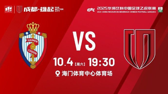 比赛日2025华润饮料中乙联赛 第28轮⚽ 海门珂缔缘 vs 成都蓉城B队📅 10月4日(周六)19:30🥅 海门体育中心体育场...