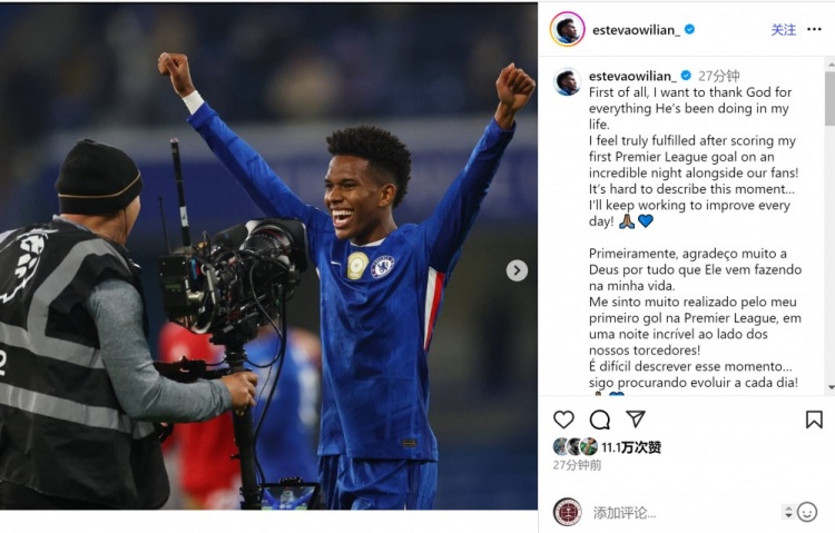 埃斯特旺社媒晒出庆祝的照片,配文:“首先,我要感谢上帝在我生命中所做的一切。在与球迷共度的非凡之夜攻入个人英超首球之后,我感到无比满足!