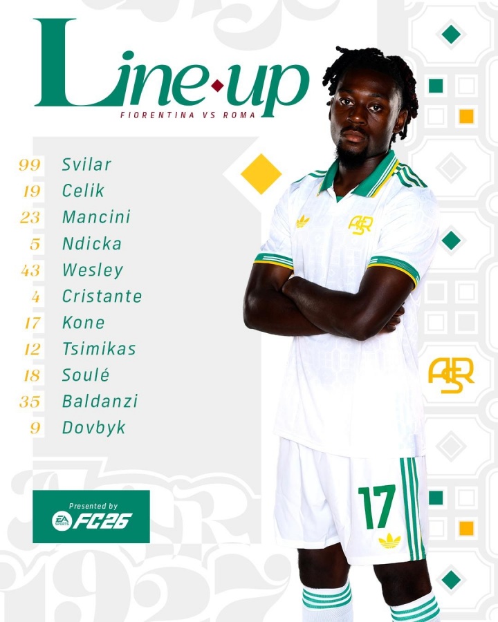罗马首发:99-斯维拉尔、19-切利克、23-曼奇尼、35-巴尔丹齐、5-恩迪卡、43-韦斯利、12-齐米卡斯、4-克里斯坦特、17-科内、18-苏莱、9-多夫比克