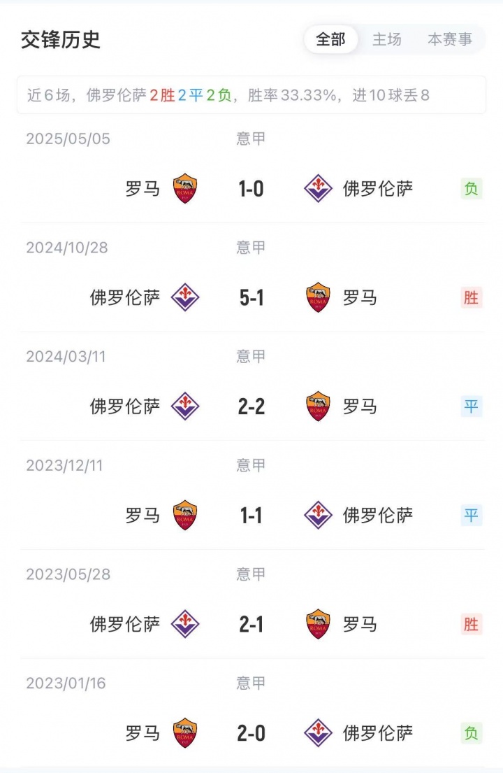 积分榜方面,罗马4胜1负排在积分榜第三位;佛罗伦萨开局五轮不胜,排名倒数第四。